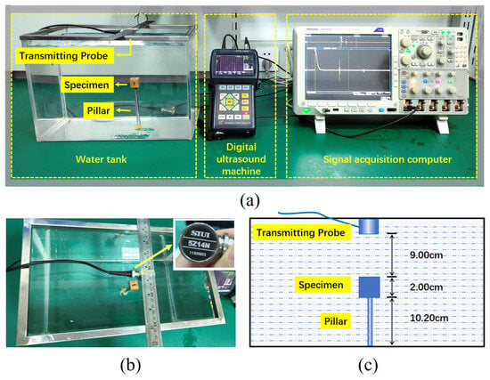 (a) Experimental system of ultrasonic testing based on water environment simulation. (b) Top view of the water tank and ultrasonic probe. (c) Schematic diagram of vertical distances between objects placed inside the water tank.