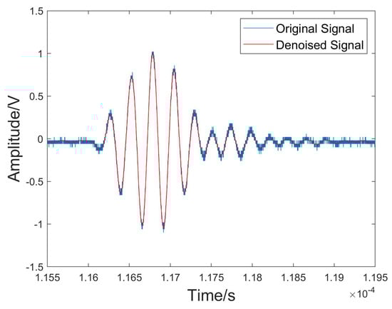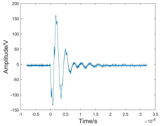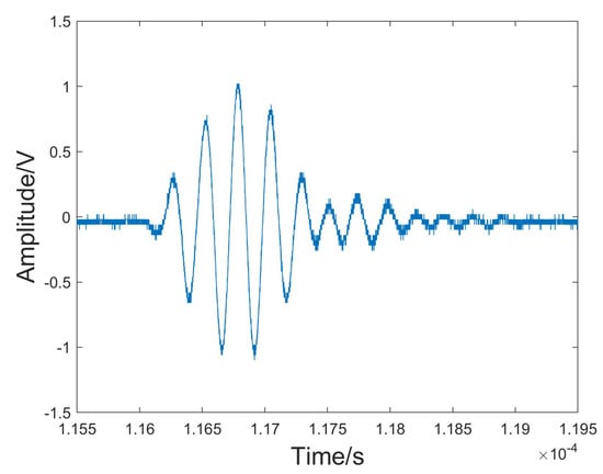 The original echo signal reflected from the sample surface was intercepted and used for analysis in this experiment. We chose the experiment of the wood specimen immersed in water as an example to illustrate the experimental procedures and subsequent analysis of the results. The chosen white birch wood specimen had a density of approximately 0.599 g/cm3 in a dry state and approximately 0.676 g/cm3 after being submerged in water for half an hour. An original ultrasound echo signal from the sample of wood is shown in Figure 4, VMD was performed on the ultrasonic echo signal. As can be seen in the figure, there was significant noise in the signal, especially at the beginning and end of the signal.