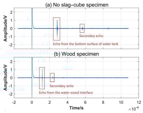 Original echo signals measured by the oscilloscope: (a) no slag cube specimen and (b) wood cube specimen placed in the water environment.