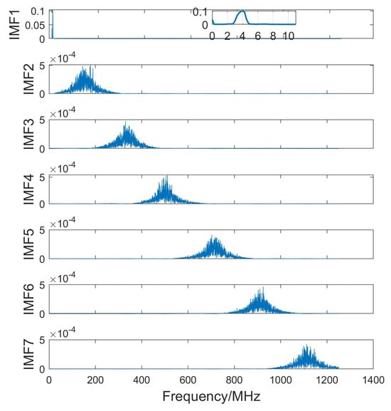 The components were sorted by frequency from low to high in Figure 5 for IMFs in the time domain and in Figure 6 for IMFs in the frequency domain. The low-frequency component IMF1 demonstrated strong periodic fluctuations, and the high-frequency component appeared to be random. IMF1 symbolized effective signals from slag inclusion defects, while other IMF components corresponded to interference or noise. The echo signals from the slag specimens could be effectively distinguished from the interference components.