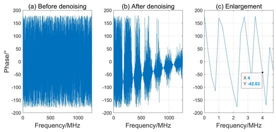 The phase spectrum can be either wrapped or unwrapped. The wrapped phase spectrum limits the phase values to the range from to , which helps with visualizing and analyzing phase changes, especially when there is a phase shift (such as a half-wave loss). The unwrapped phase spectrum, on the other hand, shows continuous phase changes from to ∞, which may be more intuitive in some cases but may not be as clear as the wrapped phase spectrum when analyzing phase jumps. Therefore, the wrapped phase spectrum was employed to analyze the phase of the echo signals reflected from the slag specimen surfaces. Figure 8a,b depicts the wrapped full-phase spectrum of the echo signal from the wood specimen interface before and after the denoising process. Figure 8c presents an expanded view of the denoised phase spectrum from 1 to 5 MHz, highlighting the specific frequency range of interest.