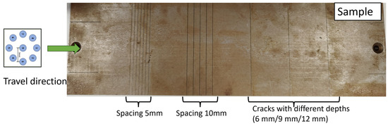Images of rail crack testing are shown in Figure 1. The customized multi-channel EC instrument, previously reported [18], is employed to acquire the EC probe signals from the coil array. The probe is moved above the testing sample across the cracks illustrated in Figure 2. This sensor can provide 36 independent measurements from all various coil combinations, featuring multiple coil spacings and sensitive orientations. By scanning once, abundant information about the defects can be collected for further analysis.