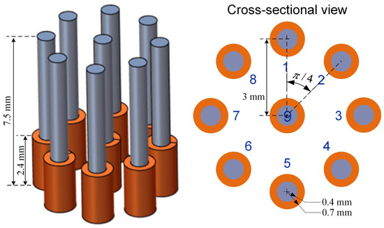 Each coil consists of 200 turns of copper enameled wire with a diameter of 0.05 mm, as shown in Figure 1. In a rectangular coil cross-section, there are five layers, with 40 turns in each layer. The coil dimensions include an outer radius of 0.7 mm, an inner radius of 0.4 mm, and a height of 2.4 mm. A ferrite core is inserted in each coil to increase flux density. The implemented coil follows the previous study [18]. The amplitude of the excitation current is around 5 mA.