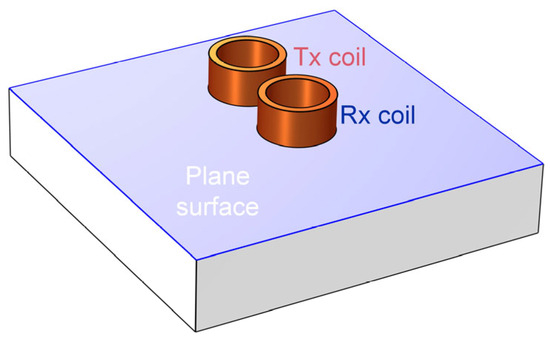 On the surface of the tested plane shown in Figure 4, the sensitivity of conductivity between representative coil pairs is shown in Figure 5. The electric field intensity in Equation (1) is calculated by the COMSOL 6.0 software, in which the electrical conductivity and relative magnetic permeability of the tested plate are 2 MS/m and 100, and the relative magnetic permeability of ferrite cores is 2000. There exists a high-value region of sensitivity between the transmitting (Tx) and receiving (Rx) coils. The sensitivity maps show that the measurements of different coil pairs contain complementary areas on the plane. By combining these measurements, the details of the cracks could be reconstructed.