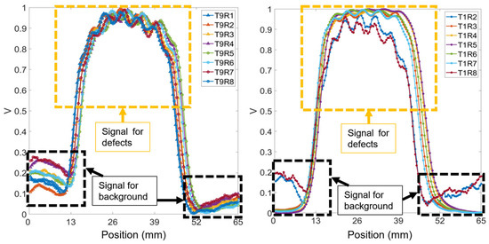 To obtain the 1-D scanning results of defect distribution, the arithmetic mean of 2-D reconstruction results is aligned into a vector with elements corresponding to each testing point of the probe, , represents the number of testing points.
