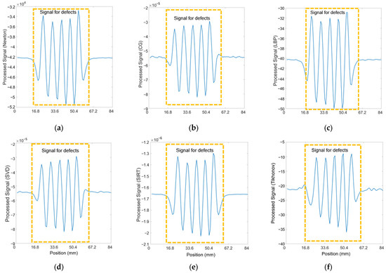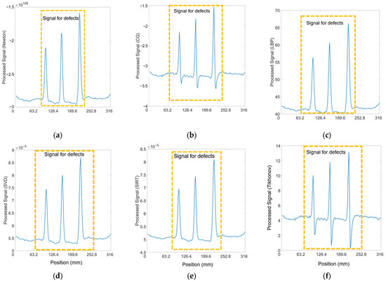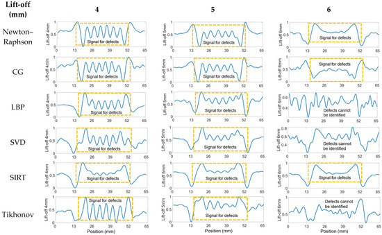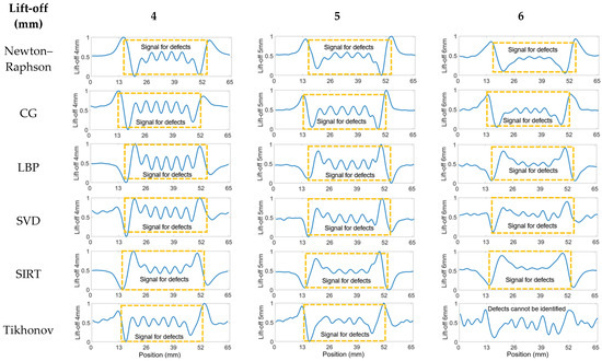 The processed data utilizing all the algorithms can be observed in Figure 8. All 36 pairings of received signals are employed when applying inverse method algorithms. It can be noted that the signals for seven cracks, each spaced 5 mm apart, are distinguished from a significant bump into seven peaks when the lift-off is set to 4 mm with inverse algorithms applied. At a 5 mm lift-off, the Newton–Raphson, CG, and LBP methods continue to exhibit good results. However, when the lift-off increases to 6 mm, the crack signals are obscured by noise, rendering the plots devoid of useful information. The criterion for cracking is the visibility of clear individual peaks with clear intervals above the noise signals. Therefore, the preferred algorithmic methods are Newton–Raphson, CG, and LBP, with the processed signals at a lift-off of 4 mm, 5 mm, and 6 mm.