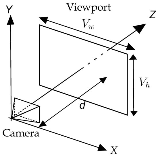 Two entities are defined for the rendering process. The first one is the camera which has attributes such as observer position and orientation, and the second is the viewport, which is a three-dimensional representation of the canvas []. These two entities are shown in Figure 1. The camera is located at the origin of the coordinate system with an orientation equal to the positive Z-axis, and the viewport, with dimensions , is located at a distance d from the camera along the Z-axis.