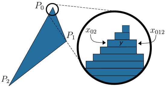 The first step in the rendering process of a triangle is the rendering of its three vertices. Once the positions of the three points on the canvas are known, it is possible to draw the triangle defined by them. The drawing of a filled triangle can be decomposed into several drawings of horizontal line segments, as shown in Figure 3. Therefore, a methodology to draw a triangle is to calculate the values of the two extremities, and , for each value of y, and then paint the pixels from one extremity to the other.