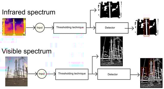 In this work, the detectors are designed to handle both visible and infrared spectra using the architecture shown in Figure 5. First, the image is processed by a thresholding technique, and the detector is then applied. We assume that the range of pixel values of input images is known, so a suitable thresholding technique is used for each kind of image. The thresholding approaches proposed in [,] are used for visible and infrared spectra, respectively.