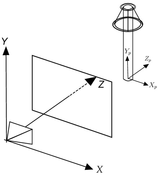 To complete the rendering process of point P, the values of () must be converted into coordinates () of the canvas, which are given in pixels, whereas the coordinates of the viewport are given in meters. Furthermore, as shown in Figure 1, the plan is parallel to the viewport, and the intersection between the Z-axis and the viewport is its center, but the origin of the canvas coordinate system is in the upper left corner, and its Y-axis is in the opposite direction to the viewport’s Y-axis. Thus, conversion from () to () requires a scale adjustment, a translation, and a change in the direction of coordinate y. These operations are summarized in (3) and (4):