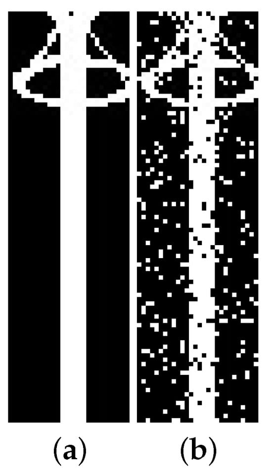 Example of noise insertion, where 10% of the pixels undergo a logical inversion. (a) Synthetic lightning rod image before noise inclusion; (b) the same image after noise inclusion.