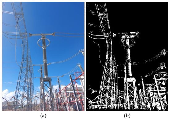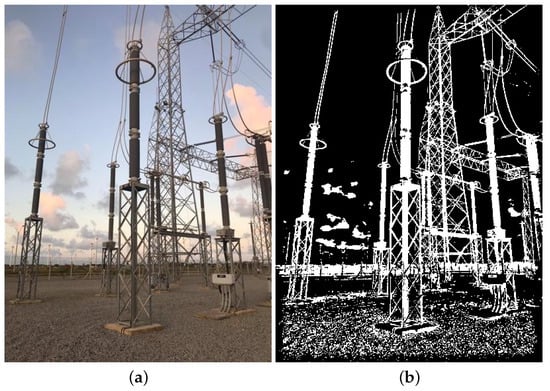 The real data used in this paper include images in visible and infrared spectra. Since these are images with pixel attributes represented with several intensity levels (i.e., Red, Green, Blue, Infrared intensities), and because we assume that black-and-white pixels are enough for equipment recognition, all real images are first converted to black and white, or binary images, as the synthetic ones. In that regard, two methods were chosen: the method proposed in [] for images in the visible spectrum, and another method proposed in [] for the infrared spectrum. Examples of resulting binary images paired with their corresponding multi-level original versions are shown in Figure 8 and Figure 9, respectively.