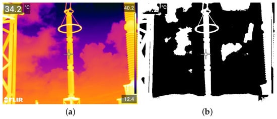 Illustration of the thresholding technique proposed in [], which is employed in this paper for images in the infrared spectrum. (a) Infrared image taken from the GImpSI dataset; (b) the same image after conversion to black and white.