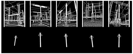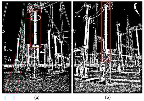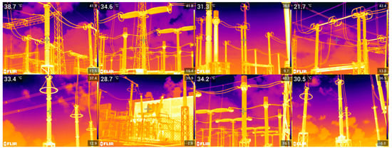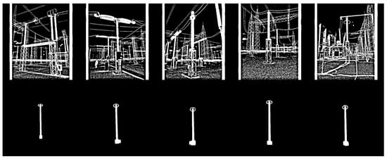 As for validation purpose, four datasets were also built. Specifically, two validation datasets were created for each target equipment: one composed solely of real binary images converted from the visible spectrum, and the other composed of real binary images converted from the infrared spectrum. It is noteworthy that, in many real images, the targeted equipment appears several times. Therefore, , which stands for the total number of times a target appears in a given set of images, is not a constant proportion of , the total number of images in that set, as presented in Table 2. Instances of the four validation datasets are shown in Figure 12 (visible) and Figure 13 (infrared).