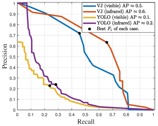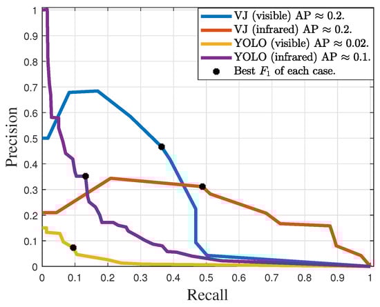 The precision–recall curves obtained with VJ and YOLO detectors, trained for lightning rod detection, are shown in Figure 14. YOLO achieved approximate AP values of 0.1 and 0.2, while VJ achieved approximately 0.5 and 0.6. The best operating points of the detectors are summarized in Table 4. The maximum measure of the YOLO was smaller than 26%, for both spectra, while the VJ detector obtained 55.8% for images in the visible spectrum, and 60.5% for infrared images.