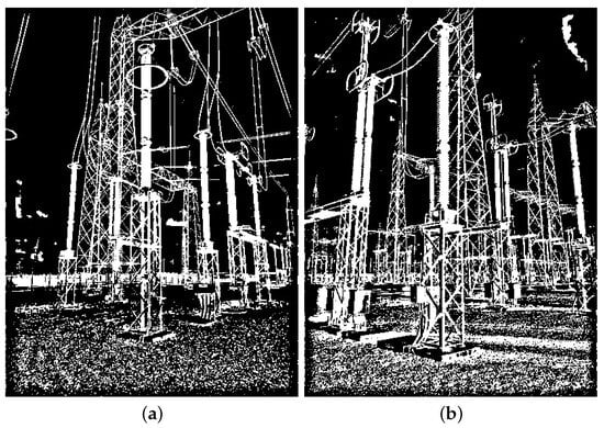 In addition to positive synthesized images of both targets, negative samples were also included in both training datasets. However, unlike the positive instances, negative samples were not synthesized, but taken from the GImpSI dataset, corresponding to images of non-targeted equipment plus noisy backgrounds. Thus, 1000 real color images in the visible spectrum were converted to binary and added to the two training datasets. As a result, two training datasets were created for each equipment, each containing 2000 synthetic examples of the target equipment and 1000 real negative examples. Examples of images from these datasets are shown in Figure 10 and Figure 11 for the lightning rod and potential transformer, respectively.