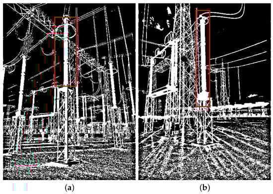 However, regardless of which detector exhibited superior performance concerning the training and validation datasets, the higher values experimentally observed seem to corroborate that one may rely solely on synthetic images as positive examples during the training phase for rigid target objects. In this context, the results obtained from the VJ detector suggest that a detector can achieve satisfactory outcomes, even if the score for the VJ detector is lower than what is typically achieved when it is trained with color images. Besides the information carried out by the target colors and textures, we also hypothesize that the VJ detector’s performance is somewhat compromised by distortions experienced by electrical equipment images during the thresholding process, particularly distortions induced by sunlight. For instance, in Figure 16, an image is shown where there was a relevant distortion in the lightning rod, to the point that the VJ detector is unable to detect it.
