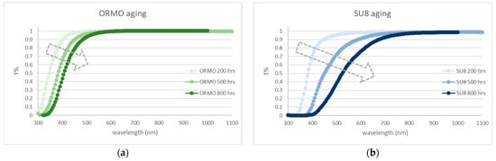 Transmission spectra of (a) ORMO and (b) SU8 derived from UV-VIS spectroscopy, after 200 h, 500 h, and 800 h of thermal treatment at 125 °C.