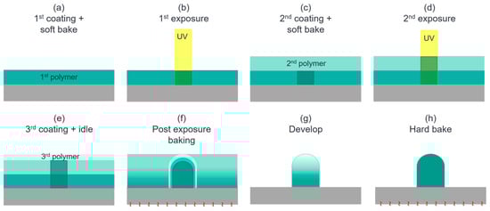 (a) The 1st spin-coating and soft bake to derive a uniform SU8 film of 20 µm thickness. (b) The 2nd spin-coating and soft bake to place a uniform SU8 layer of 30 µm thickness over the 1st SU8 layer. (c) UV exposure to define the ML and pedestal dimensions and generate photo-acids in the 1st and the 2nd SU8 layers. (d) The 3rd spin-coating of an SU8 layer, which is left idled for about 1 hour to control the photo-acid diffusion. (e) PEB and (f) follow-up development performed to remove the extra polymer without a crosslink, forming the shape of the lens. (g) Hard bake to generate higher degrees of crosslink and dehydration.