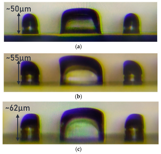 Two MLs on pedestals (leftmost and rightmost objects) formed by using Method 1 with a UV dosage of (a) 100 mJ/mm2 (b), 140 mJ/mm2, and (c) 160 mJ/mm2.