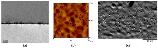 In this study, we applied RPCVD to grow a 1 µm thick Ge film on a Si substrate (100 plane). Figure 7a shows the cross-sectional TEM image of the 1 µm thick Ge film deposited on a Si substrate. Misfit dislocations at the Ge/Si interface along with several threading dislocations can be observed. In the Ge region away from the interface, most defects merge and disappear, resulting in a relaxed Ge layer with a high degree of single crystalline structure. Figure 7b shows the top-view atomic force microscope (AFM) image, and Figure 7c shows the top-view SEM image, both derived after applying an etch pit method. The total defect density is then estimated to be on the order of 1 × 107 cm−2.