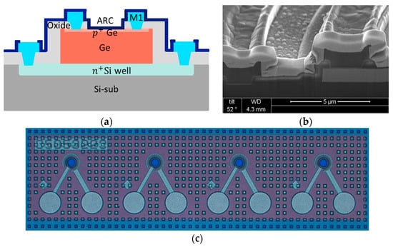 Ge p-i-n PDs are fabricated with a process compatible with standard CMOS technology. After the 1 µm thick Ge film is grown on an 8-inch p-type Si substrate by RPCVD, the device active area is defined by double mesa patterning with i-line lithography, followed by dry etching processes. The p-i-n junction is formed by first implanting phosphorus into the Si substrate and then implanting boron into the Ge film surface. A film of 600 nm thick silicon dioxide (SiO2) is subsequently deposited by PECVD as an inter layer dielectric (ILD), followed via opening with a reactive ion etching (RIE), and Ti/TiN/Al/TiN deposition/patterning with physical vapor deposition (PVD)/transformer-coupled plasma (TCP) etching. A silicon nitride layer (SiN) is then deposited as an anti-reflection coating, followed by removal of the silicon nitride on top of the metal pad. The schematic plot of the device structure is shown in Figure 8a. In Figure 8b,c, the cross-sectional SEM image and top-view OM image of the fabricated devices are shown.