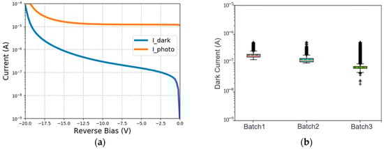 The I-V characteristics of the fabricated Ge p-i-n PDs with and without integrating the polymer MLs are characterized using the Keysight B1500 semiconductor device analyzer. The dark currents of 29 µm diameter devices without MLs are measured to be ~138 nA at −3 V bias. By collecting the dark currents from devices in different diameters without ML, the bulk dark current density Jbulk and the surface dark current density Jsurface are extracted to be around 9.25 mA/cm2 and 7.56 µA/cm, respectively. Further measurements show that there is almost no observable difference between the dark currents measured from the Ge p-i-n PDs with and without the polymer MLs. Finally, the responsivities of the 29 µm diameter devices without MLs are measured using an 850 nm fiber laser connected to a pigtailed focuser. The responsivity is measured to be ~0.6 A/W at −3 V. The typical dark and photo I-V curves measured from the 29 µm diameter devices without MLs are shown in Figure 10a, and the statistics of dark current at −3 V bias from three batches of the fabricated Ge p-i-n PDs are shown in Figure 10b. Each batch contains 600 DUTs in the box plot, and the outliers are from the ugly dies.