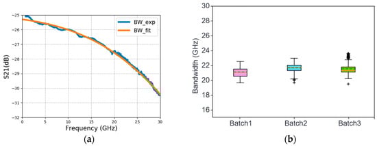 To obtain the 3 dB bandwidths of the fabricated Ge p-i-n PDs, we use the Keysight PNA N5244B network analyzer with a working frequency ranging from 10 MHz to 43.5 GHz to measure the S parameters. An iXblue optical modulator is used to modulate the laser light at 850 nm. Figure 11a shows the frequency response of a fabricated 29 µm diameter device at −3 V bias, indicating a 3 dB bandwidth of 22.5 GHz. Figure 11b shows the statistics of 3 dB bandwidth at −3 V bias from three batches of the fabricated Ge p-i-n PDs. Each batch contains 120 DUTs in the box plot, and the outliners are from the ugly dies.