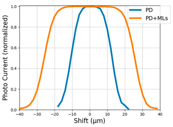 In order to demonstrate the improvements of the effective optical window size through ML integration, we mount the pigtailed focuser, which is connected to an 850 nm fiber laser, on a high-precision automatic linear stage, and sweep it across the fabricated PDs with MLs. Figure 12 shows the normalized photo response versus horizontal displacement. The blue line represents the PD without ML, and the orange one represents the PD with ML. Note that the displacement is relative between the center of the focuser and the PD. It can be seen that the effective optical window size, defined by the full width at half maximum (FWHM) of the curves in Figure 12, is increased from ~24 µm (when there is no ML) to ~52 µm (when there is an ML), demonstrating the effectiveness of the integrated ML. Note that such sweepings are performed in both x and y directions to examine the symmetry of the integrated ML, and we find no particular difference between the 2 directions implying good circular symmetry of the integrated ML.