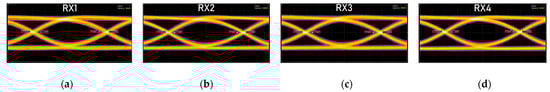 A chip-on-board (COB) module including our Ge PDs integrated with polymer ML, commercial transimpedance amplifiers for acquiring voltage signal from the PD, 850 nm vertical-cavity surface-emitting lasers (VCSELs), and drivers for the lasers, are used for the eye diagram and bit error rate measurement. A non-return-zero (NRZ) pseudorandom binary sequence (PRBS) data stream with a length of 231-1 is applied to the driver, and either a digital communication analyzer (Keysight, E8363B) or a signal quality analyzer (Anritsu, Atsugi, Japan, MP1800A) is connected to the COB module for the eye diagram and bit error rate measurement, respectively. In Figure 13a–d, the measured eye diagrams from the output of a four-channel photo-receiver using this COB module with input data rates all set at 25.78 Gbps and device biases all set at −3.3 V are shown, in which clear eye diagrams can be observed. The temperature of the COB module is controlled to be 25 °C. Then, the sensitivities are measured to be −9.2 dBm with a bit error rate (BER) of 10−12, is competitive compared to commercial products. Note that because the extinction ratio of the signals is 4.78 dB, the sensitivities defined by optical modulation amplitude (OMA) and average optical power (AOP) are almost the same.