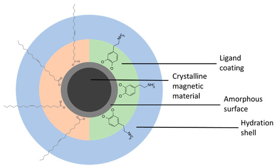 Schematic drawing of a single magnetic nanoparticle, showing the crystalline core, which is surrounded by an amorphous shell, the ligand coating, and the hydration shell. From the ligands here, oleic acid, as an example of a hydrophobic ligand, and dopamine, as a hydrophilic coating, is shown. Not drawn to scale.