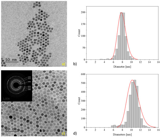 IONPs synthesized by the thermal decomposition method generally represent a highly crystalline core of Fe3O4, which includes a narrow amorphous surface boundary consisting of FexOy and a coating of oleic acid and oleylamine molecules, which renders the particles hydrophobic. Due to the fact that these IONPs start to nucleate within a very short time interval, the as-synthesized IONPs show a narrow size distribution. The obtained seed IONPs showed two peaks in the DLS, one at the desired size of 10 nm and another peak at 250 nm, showing the presence of large precipitates (see Supplementary Materials). To remove these aggregates and reduce the size distribution, a size fractionation by the precipitation of the IONPs from hexane solution using ethanol was performed. After the precipitation and removal of the aggregates, the sample (called NJ15) showed a hydrodynamic radius of 12.1 nm with a PDI of 5.9%. The TEM images showed spherical IONPs arranged in densely packed two-dimensional arrays (Figure 2a). The average size of the IONPs determined by ImageJ [44] was 7.9 ± 0.7 nm (Figure 2b). These seed particles were grown and purified, and the resultant sample NJ19 was analyzed by DLS and TEM (Figure 2c). The hydrodynamic radius increased up to 21.6 nm, and the size determined by size evaluation of the TEM images was 10.6 ± 1.1 nm (Figure 2d), see Table 2. Selected area electron diffraction allowed the inverse spinel structure to be indexed, indicating that the received particles consist of magnetite (inset of Figure 2c). Under the assumption that all the Fe(acac)3 in the reaction mixture were transformed quantitatively into Fe3O4 and added to the seed crystals, the diameter dIONP of the grown particles could be estimated by the formula given in Equation (3) [45].