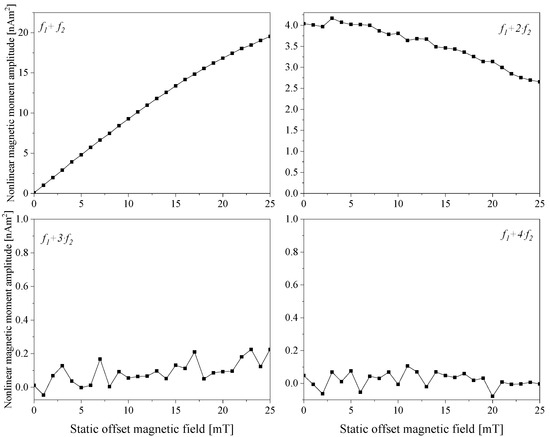 The samples were measured using the EMOM setup introduced in Section 2.3. Figure 3 depicts the nonlinear magnetic moment amplitude response of the first four mixing harmonics (f1 + f2, f1 + 2⋅f2, f1 + 3⋅f2 and f1 + 4⋅f2) for the sample NJ15. Here, the magnetic response signal was mainly observed at the first two harmonics, and the measurement signals at f1 + 3·f2 and f1 + 4·f2 fluctuated around the zero level. Moreover, the characteristic features of the signals (i.e., minima, maxima, and zero crossings) were not seen since they were out of the scanning range of the static offset magnetic field.