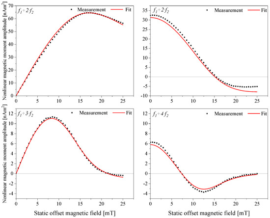 Measured nonlinear magnetic moment responses of the sample NJ19 in an immobilized state at mixing frequencies, f1 + f2 (top left), f1 + 2⋅f2 (top right), f1 + 3⋅f2 (bottom left), and f1 + 4⋅f2 (bottom right), over a static magnetic offset field range from 0 mT to 25 mT. The black-filled squares represent the measurement data of the sample, and the solid red line represents the fitting to the respective measurement data.