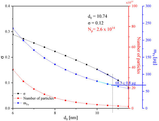 For every median of the distribution (d0), the best-fitting combination of the width of the distribution (σ) and the number of particles (Np) was determined. The parameters were then utilized to calculate the respective mass of iron (mFe) for each distribution with
