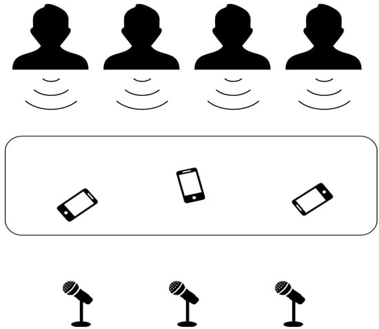 A visual representation of the Spead-M3C dataset formulation layout, featuring four speakers and three aligned microphones with the addition of three randomly positioned smartphones.
