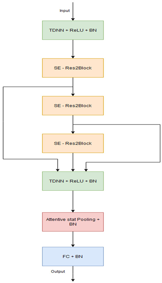 ECAPA-TDNN evolves the X-vectors’ framework with essential modifications. The time delay convolutional layers are replaced by complex one-dimensional Res2Net units embedded with skip connections. This enables the network to distinguish progressively nuanced patterns. In addition, Squeeze-and-Excitation (SE) blocks are integrated into these modules, intelligently upscaling the feature responses across channels to highlight those most critical for speaker diarization. Finally, ECAPA-TDNN augments the statistics aggregation module with the integration of attention mechanisms, allowing the network to zero in on highly relevant input regions for even more robust speaker representation. The model uses 80-dimensional log Mel Filterbank energies as inputs and generates 192-dimensional representations. The architecture is presented in Figure 2. In the presented study, we employ the variation using 1024 filters C in the convolutional layers. Both TDNN layers have a dilation spacing of 1 and kernel sizes of 5 and 1, respectively. All SE—Res2Blocks use a kernel size of 3 with increasing dilations starting from 2 at the first block. This specific model variation has 14.7 million parameters.
