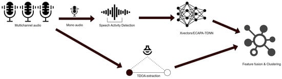 Another important subfield of multimodal diarization includes spatiotemporal systems. Speaker diarization systems that exploit the spatial characteristics of speech and sound have been proposed in previous related studies. An earlier approach focused on the time delay between the pairs of microphones to construct a similarity matrix of the sound segments [24]. Other works [25] benefit from acoustic beamforming techniques to construct single-channel reference audio that enhances spectral information extraction. Additionally, MFCC and TDOA values can be combined to form a spatiotemporal information domain [26]. Another spatial approach for speaker diarization utilizes Direction of Arrival (DOA) information [27]. In a related study [28], Multiple Distant Microphones (MDMs) were employed to extract DOA values and combine them with acoustic feature information. A recent study [29] utilizes spatial information to implement a real-time speaker diarization system. Another work proposes a neural network architecture with multichannel input [30]. Our previous work [31] focused on information fusion between speaker embeddings from DNN and TDOA values from microphone pairs.