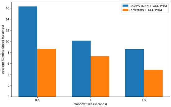 As demonstrated, our proposed system presents an improvement in the DER compared to when only using the DNN model, indicating the importance of incorporating spatial information into the speaker diarization process. Moreover, this reduction in DER is more pronounced with the dataset containing a larger number of microphone pairs. It is evident that the addition of more TDOA values enriches the construction of speaker representations, enhancing the ability of the system to accurately distinguish speakers. Furthermore, our proposed method offers an advantage in computational efficiency. In Figure 4, a comparison of the average running speed between the two models is presented. The best performing variation—the X-vectors architecture with the GCC-PHAT algorithm—turned out to be less computationally demanding than the ECAPA-TDNN model. In addition, it is essential to take into consideration that the X-vectors model is significantly more parameter-efficient, with only 4.2 million parameters compared to the 14.7 million parameters in the ECAPA-TDNN, as described in Section 2.