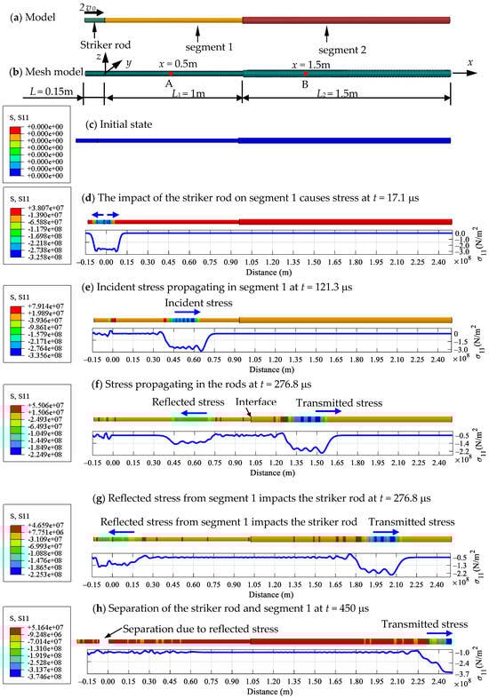The geometrical shape and finite element mesh of the Rayleigh–Love rod model are plotted in Figure 5a,b, and the relevant parameters used in the Rayleigh–Love rod model are shown in Table 1. The elastic material wave velocity c of the rod and striker materials was computed as 5782.69 m/s. In the Abaqus finite element analysis code, the solid element-type C3D8R was employed, with 10,947 nodes and 8448 elements in the model, as shown in Figure 5b. The detailed stress variations are demonstrated in Figure 5c–h at the time from the initial state to 450 μs.
