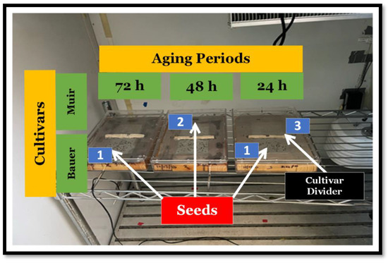 Subsequently, the containers were positioned within the same growth chamber (CMP3244; Conviron-Controlled Environments Limited, Winnipeg, MB, Canada) maintained at a constant temperature of 41 °C, and they were kept in the dark, as previously described by [15]. The growth chamber functioned solely as a temperature control environment, ensuring the maintenance of the specified conditions for the seed aging process.