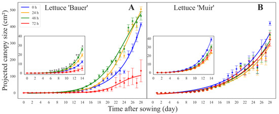 The PCS increased over time in all treatments and two lettuce cultivars (Figure 2). Initially, no germination was observed, but around day five, PCS slightly increased, followed by exponential growth afterward. Contrary to our hypothesis, the seeds of the cultivar ‘Bauer’ treated with SSAA for 48 h showed a greater size and fast growth throughout the germination period, followed by those treated for 24, 0 (control), and 72 h. We observed significant differences in PCS on days 6, 7, 8, 9, 10, 11, 12, 13, and 14 (Figure 2A).