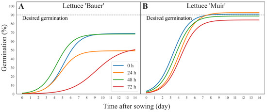 Sigmoidal curves showing the germination percent over time colored according to the saturated salt accelerated aging (SSAA) periods in the lettuce (Lactuca sativa) cultivars (A) ‘Bauer’ and (B) ‘Muir’. Germination percent calculated from data obtained by the embedded computers. The gray dashed line shows the desired germination (90%), and where the curve does not reach, the line means poor germination.