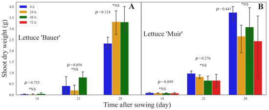 Shoot dry weight collected at 14, 21, and 28 days after sowing of the lettuce (Lactuca sativa) cultivars (A) ‘Bauer’ and (B) ‘Muir’. Each bar and the error bars indicate the mean and standard deviation of 16 seedlings in each saturated salt accelerated aging (SSAA) period. There were four SSAA periods in total, but the cultivar ‘Bauer’ seeds treated for 72 h (A) did not survive and the treatment was removed from the analysis (hence, only three treatment periods). * NS in each harvest denotes a non-significant difference, and values followed by the same letter are not significantly different according to Tukey’s HSD at α = 0.05.