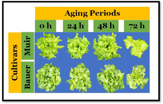 Statistical analysis both of PCS and the dry weight showed no significant differences. Looking at the mature plant images, there were no visible differences except for the plants that resulted from seeds aged for 72 h (Figure 5). These plants showed a reduced size and pale leaves and did not properly reach maturity as the other plants (head formation). However, these variations were not significant in the dry weight of the cultivar ‘Muir’, and the cultivar ‘Bauer’ did not have enough plants to allow multiple comparison tests.