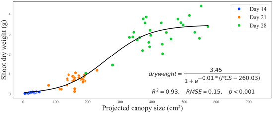 The relationship between the projected canopy size (PCS) and the corresponding shoot dry weight colored by days of harvest (to collect the shoot dry weight). The black solid line shows a sigmoidal regression with an equation, regression summaries of the coefficient of determination (R2), root-mean-square error (RMSE), and p-value (p).