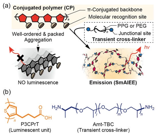 To this end, we focused on the supramolecular assembly-induced emission enhancement (SAIEE) mechanism [10,11]. The luminescent states in SAIEE systems are spontaneously and dynamically tuned by competing reactions between a small molecule-based fluorophore, a cross-linker, and additives through non-covalent interactions. This strategy was recently utilized to prepare stimuli-responsive systems because their properties can be easily developed and tuned without complicated molecular designs and syntheses [12]. More importantly, SAIEE can help solve the aggregation-induced quenching problem in fluorophores, thereby facilitating the realization of solid-state-emission devices and sensors. However, research on the manipulation of emission states in CPs mediated by the self-assembly of multiple molecules is in its nascent stages. To broaden this concept for the preparation of CP-based luminescent devices and sensors, we herein report a solid-state-emissive sensor based on a supramacromolecular assembly-induced emission enhancement (SmAIEE) system that is achieved by mixing only the component polymers (Figure 1a). In this study, we used a simple acid–base interaction between a well-known CP and a non-CP as the driving force to achieve a CP-based emission system (Figure 1b) [13]. Specifically, we utilized polythiophene with a carboxy side chain (P3CPrT) as the luminescent unit of the system. We also employed an isopropylamine-terminated polypropylene/polyethylene triblock copolymer (Amt-TBC) as the transient cross-linker to control the assembly state of P3CPrT. Isopropylamine at both ends of Amt-TBC acted as a junctional site for each carboxy side chain of the thiophene monomer. Furthermore, these functional groups behaved as molecular recognition sites for analytes [14]. This polythiophene ensemble, prepared simply by mixing and drying, enabled the spontaneous fabrication of a fluorescent film sensor for structurally similar biogenic amines and aminoglycosides.