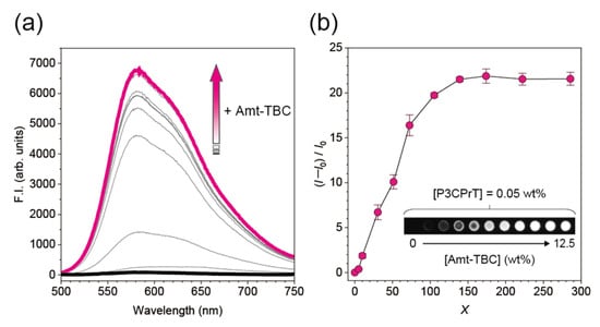 In summary, we demonstrated a novel strategy for preparing CP-based solid-state emission systems using only a blend of polymer components. The mixture of P3CPrT and Amt-TBC enabled the spontaneous fabrication of a fluorescent film-type sensor for amine derivatives. The prepared film exhibited distinct fluorescence emissions, and its fluorescence signal was selectively modulated by the addition of analytes. Although we selected P3CPrT and Amt-TBC as representative components to prepare stimuli-responsive fluorescent films in this study, various polymers could be employed depending on the application [31]. Because the proposed displacement assay system possesses high simplicity and universality, we believe that polymer-ensemble systems represent a novel strategy for achieving CP-based luminescent devices and molecular sensing platforms. Further demonstration of these newly proposed polythiophene devices is being conducted in our laboratory.