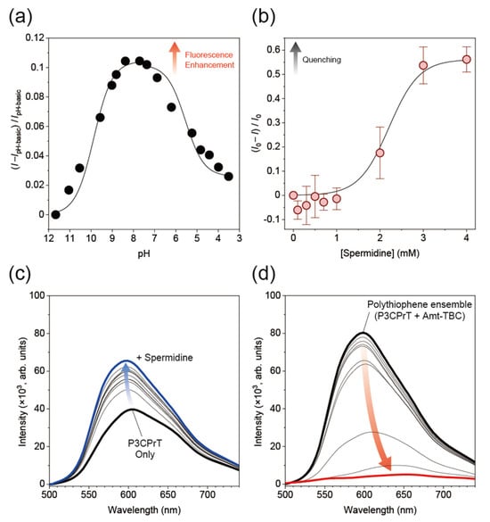 The responsiveness of the polythiophene-ensemble film to chemical stimuli prompted us to examine the optical sensing of charged analytes. In particular, the assembled carboxy moieties on the polythiophene wire may have discriminated between the cationic states in the analytes [21,22]. Hence, amine derivatives [23] were employed as model targets to evaluate the molecular recognition ability of the SmAIEE system. The fluorescence intensity of the prepared film gradually decreased with increasing concentrations of spermidine, a typical polyamine (Figure 3b). The sigmoidal curve obtained in the titration experiment suggested that spermidine was recognized through multivalent interactions and/or competitive reactions between each component polymer and the analyte. To investigate the mechanism of the response of the polythiophene ensemble to the analytes, we confirmed the fluorescent property of P3CPrT in the liquid phase upon the addition of spermidine in the presence of Amt-TBC (Figure 3c,d). The fluorescence signal of the polythiophene-ensemble solution decreased with the addition of spermidine. Notably, the presence of Amt-TBC in the P3CPrT solution significantly amplified the fluorescence response of the system to the addition of spermidine. The observed spectral shift in the solution suggested that the fluorescent response of P3CPrT originated from the dynamic displacement of Amt-TBC (i.e., the transient cross-linker) in the polythiophene ensemble and the generation of the P3CPrT–spermidine complex [24]. The DMSO solution of P3CPrT without additives fluoresced weakly (Figure 3c), while the emission of the polythiophene-ensemble solution was almost quenched and slightly red-shifted with the addition of spermidine (Figure 3d). As mentioned previously, the hierarchical arrangement (i.e., the extension of the conjugation length) of the P3CPrT chain was induced by the presence of Amt-TBC. This estimation was supported by the results obtained in this comparative study. In addition, the higher-ordered structure of P3CPrT in the presence of Amt-TBC contributed to the construction of the appropriate inclusion field for polyamine recognition. Overall, fluorescence quenching in the prepared film was triggered by the analyte-induced aggregation of P3CPrT, implying that the origin of the fluorescence response is identical to the displacement mechanism in the liquid phase. Adjustment of the arrangement of the polymer chains appears to be a promising means of manipulating the sensing ability of the system.