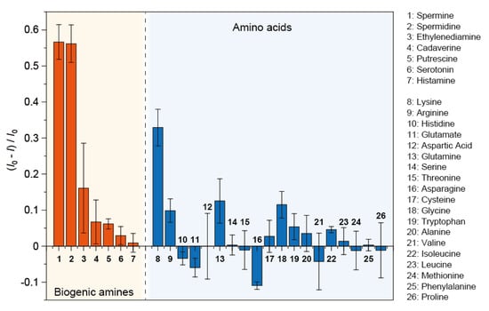 Changes in the fluorescence intensity of the polythiophene-ensemble film upon the addition of biogenic amines or amino acids in HEPES buffer solution (100 mM) with TBABr (100 mM) at pH 7.0 and 30 °C. [Analyte] = 4 mM.